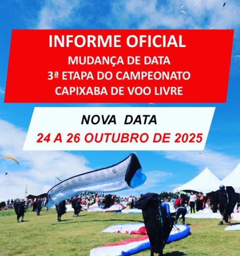 A 3ª Etapa do Campeonato Capixaba de Voo Livre, previsto inicialmente para acontecer neste final de semana na rampa do Monjolo, em Baixo Guandu, teve a mudança de data confirmada pelos organizadores.