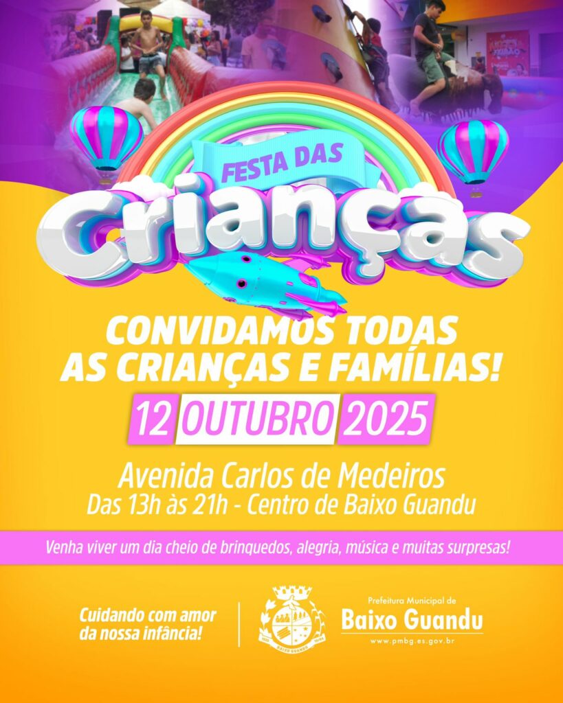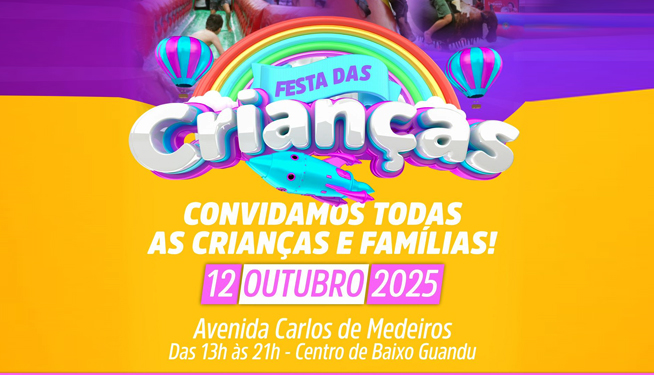 A Prefeitura de Baixo Guandu está convidando as crianças e famílias para este domingo, das 13 às 21 horas, para comemorarem ao longo da avenida principal da cidade, a Carlos de Medeiros.
