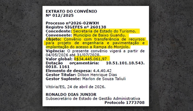 O Governo do Estado publicou no dia 24 de abril, no Diário Oficial, extrato do convênio (012/2025) que libera, através da Secretaria de Estado do Turismo, o valor de R$ 34.445.061,97 ao município de Baixo Guandu, recurso que será destinado ao asfaltamento do acesso à rampa do Monjolo.